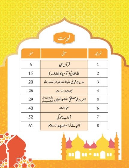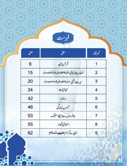 Language : Urdu Pages : 72 Binding : Softcover ________________________________________________________________ 1. Reading,Tracing,Writing,Picture identification & Coloring of Urdu Alphabet. 2. Learning of Half Letters, 2 Letters Words & 3 Letters words through Identifications,Writing and other Different Activities. 3. Identification of Animals,Birds,Flowers,Fruits,Body Parts, Colours & Numbers. 4. Ta'wwuz & Tasmiyyah with Translation. 5. Deeniyat Learning with Practice of Kalima,Duas & Surah with Translation. 6. Regular Revisions,Activities & Tests for better Understanding of Concept. 7. Basic knowlwdge about Almighty Allah, Holy Quran,Prophet(pbuh), Ahle Bait & Companions of Prophet(pbuh)in Q.&A. Format.