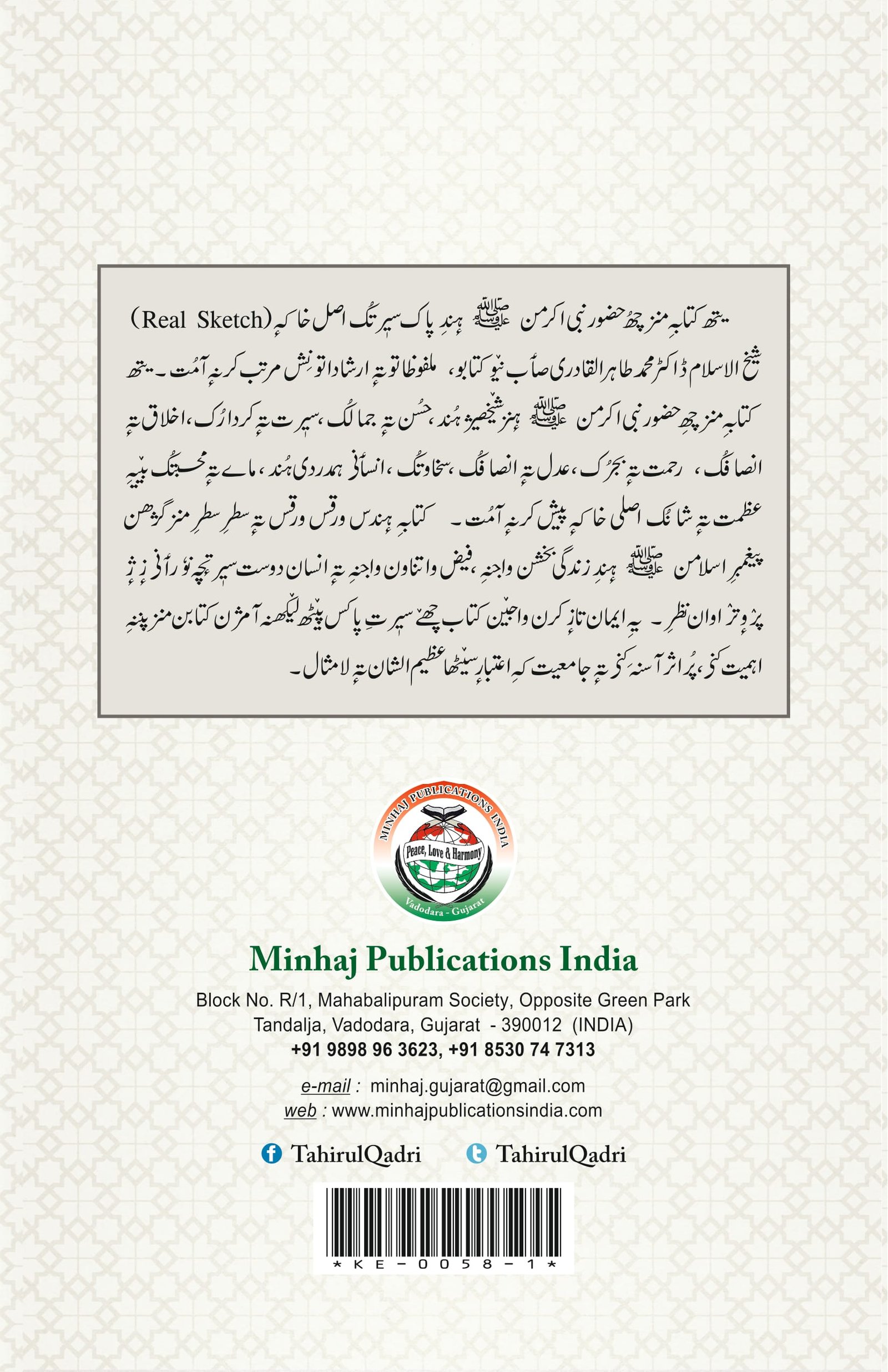 یتھ کتابہ منز چھ حضور نبی اکر من بند پاک سیر تگ اصل خاکہ (Real Sketch) شیخ الاسلام ڈاکٹر محمد طاہر القادری صاب نیو کتابو، ملفوظا تو نہ ارشاداتو نش مرتب کر نہ آئت ۔ میتھ کتابه منز چھ حضور نبی اکر من هنر شیخیره هند، حسن تہ جمالگ ، سپرت تہ کردارک، اخلاق تر انصافک، رحمت به بجڑک ، عدل پہ انصافگ ، سخاوتگ ، انسانی ہمدردی ہند ، ماے یہ میسجنگ پنیر عظمت پر شانک اصلی خاکہ پیش کر نہ آئت کتابہ ہندس و رقس و رقس به سطر سطر منز گردھن پیغمبر اسلامن له بند زندگی بخشن و اجنه ، فیض و اتناون واجنه ته انسان دوست سپر چه تو را نی زیر پروتز اوان نظر ۔ یہ ایمان تاز کرن واجنین کتاب چھنے سیرت پاکس پیٹھ لیکھنہ آمژن کتا بن منز پند اہمیت کنی، پر اثر آسنہ کو تہ جامعیت که اعتبار سیٹھا عظیم الشان تہ لا مثال۔